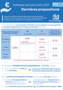 Lors de la dernière réunion de politique salariale Airbus Atlantic ce lundi 23 mars, la Direction a présenté ses dernières propositions : les revendications CFE-CGC ont été entendues et le niveau global est porté à 2,5%.
